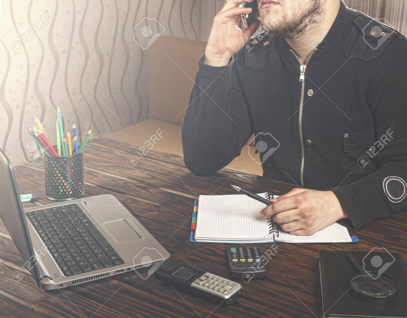 若い男性が電話で話しています フリーランサーは 自宅やオフィスの外のテーブルに座っている間 電話で話しているビジネスマンを持っています の写真素材 画像 素材 Image
